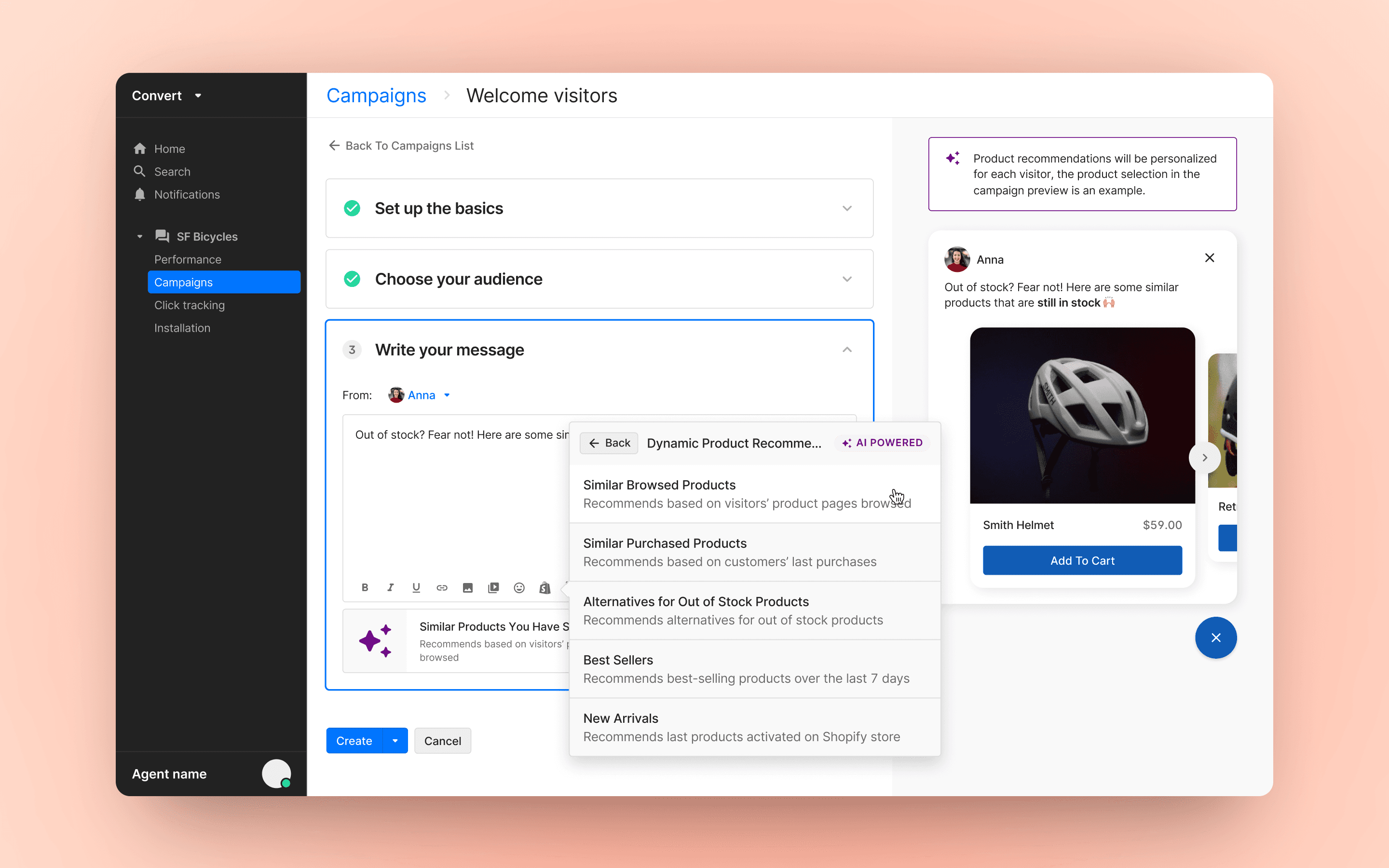 Designed a flow where the chat plugin could suggest similar products when an item was unavailable, using AI to guide customers towards alternatives.Campaign Library